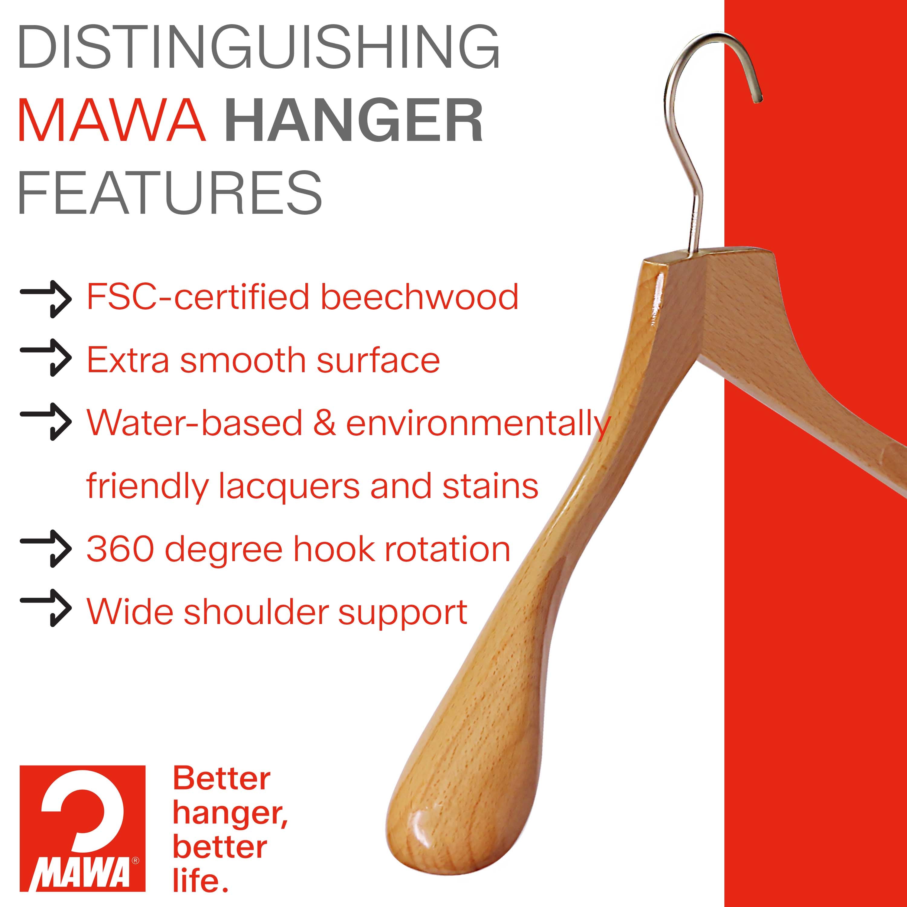MAWA hangers are designed to make our lives easier. The roatating hook offers maxiumum flexibility, while the non-slip SKIN friendly cloating ensures that clothes hang securely and without creasing. Samp garments can be hung up immediately after they have been washed, which makes ironing easier and saves time.